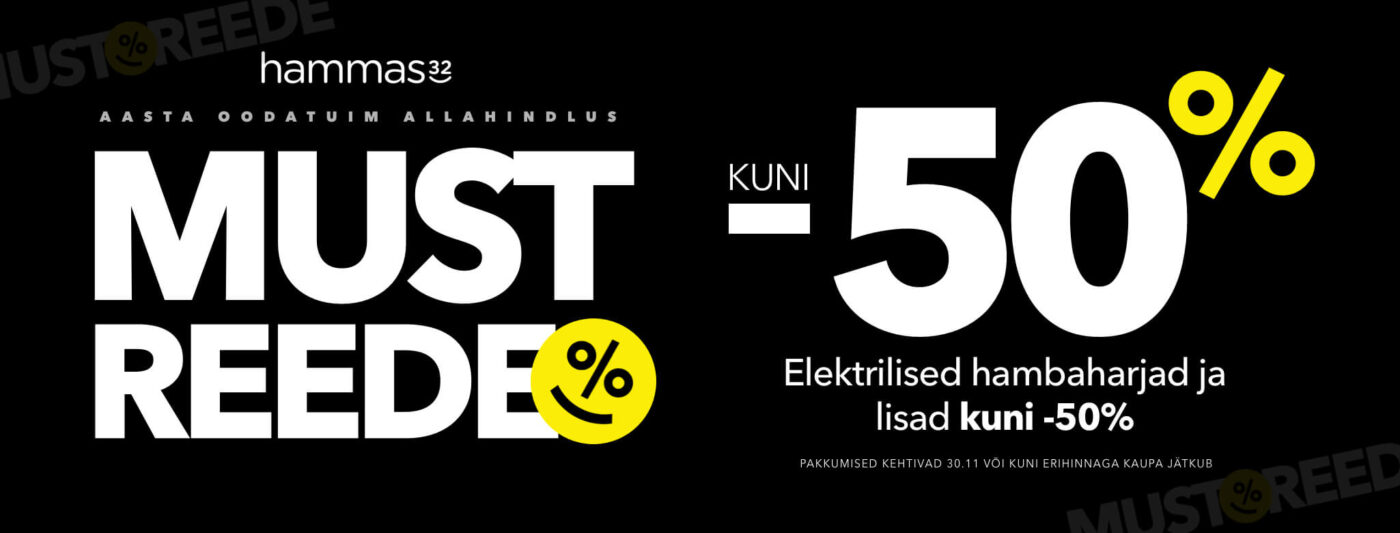 Must Reede saab alguse Hammas32 e-poes sooduspakkumistega ning kulmineerub novembrikuu viimasel reedel, mida kutsutakse vastavalt mustaks reedeks. Kõige populaarsem on see ostupüha kahtlemata USA-s, ent ka Eestis ning Euroopas muutumas järjest populaarsemaks, mil paljud tooted oluliselt soodsamad tavahinnast. Sestap soovitame juba aegsasti ostu planeerima hakata ja miks mitte, koostada endale nimekiri kõikideks suuhoolduseks vajalikest toodetest ning kingisaajatest, et need siis kampaaniaperioodil tavapärasest soodsamalt soetada. Kampaania periood on toodud allpool kampaania tingimustes.