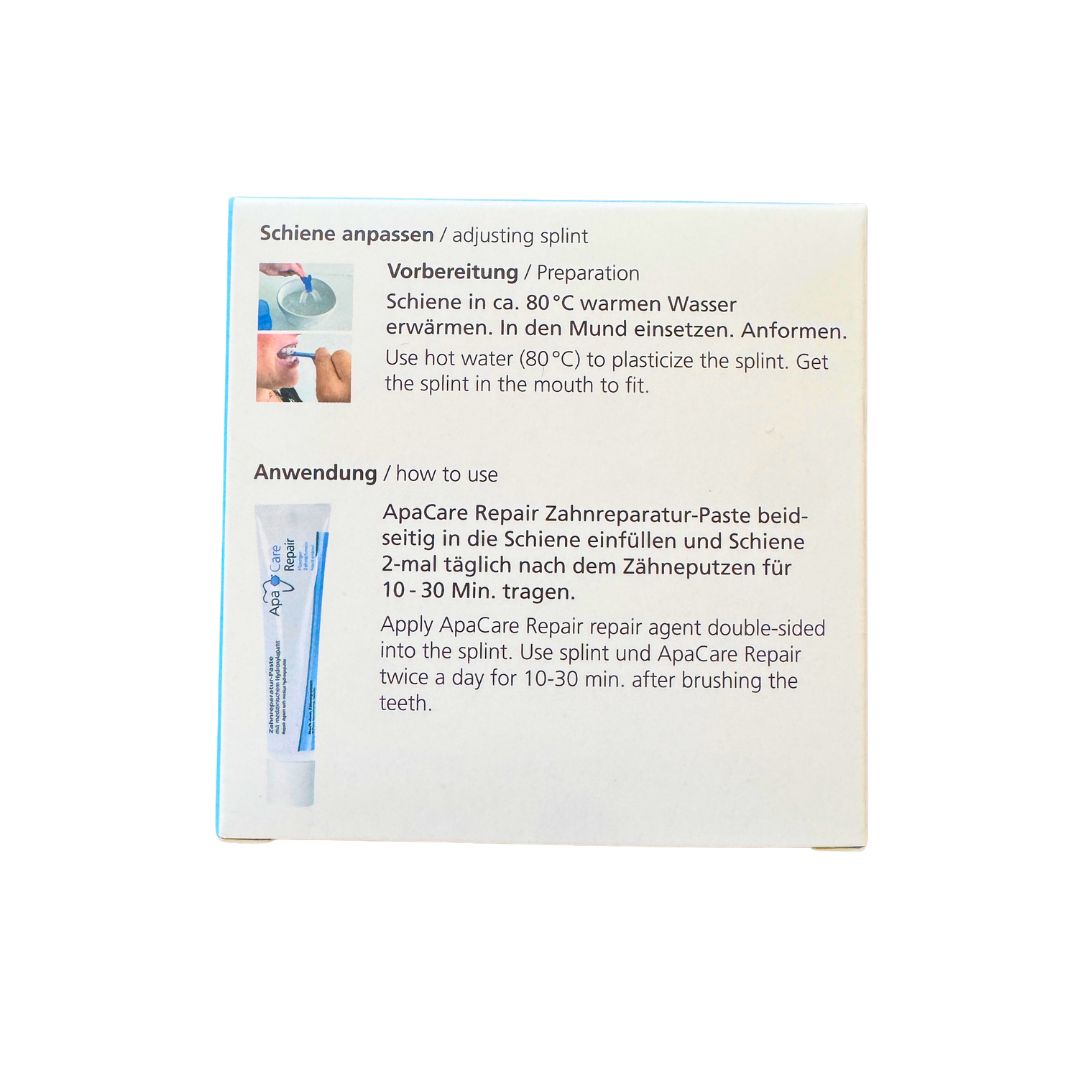 Kasutamine: Hambakape kasutamiseks aseta see enne 15 sekundiks 80 kraadisesse vette. See aitab hambakape pehmeks muuta ja Sinu hammastele sobivaks vormida. Enne ApaCare Repair geeli kasutamist peavad hambad olema puhtad. Küsimuste korral pidage nõu oma hambaarstiga.