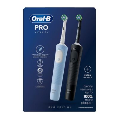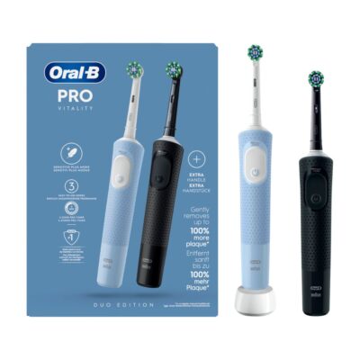 Oral-B Vitality PRO-l on ümar harjapea, mis ulatub ümber iga hamba. See teeb hambad puhtamaks ja eemaldab kuni 100% rohkem hambakattu võrreldes tavalise käsihambaharjaga. Kahte hambaharja sisaldav erikomplekt!
